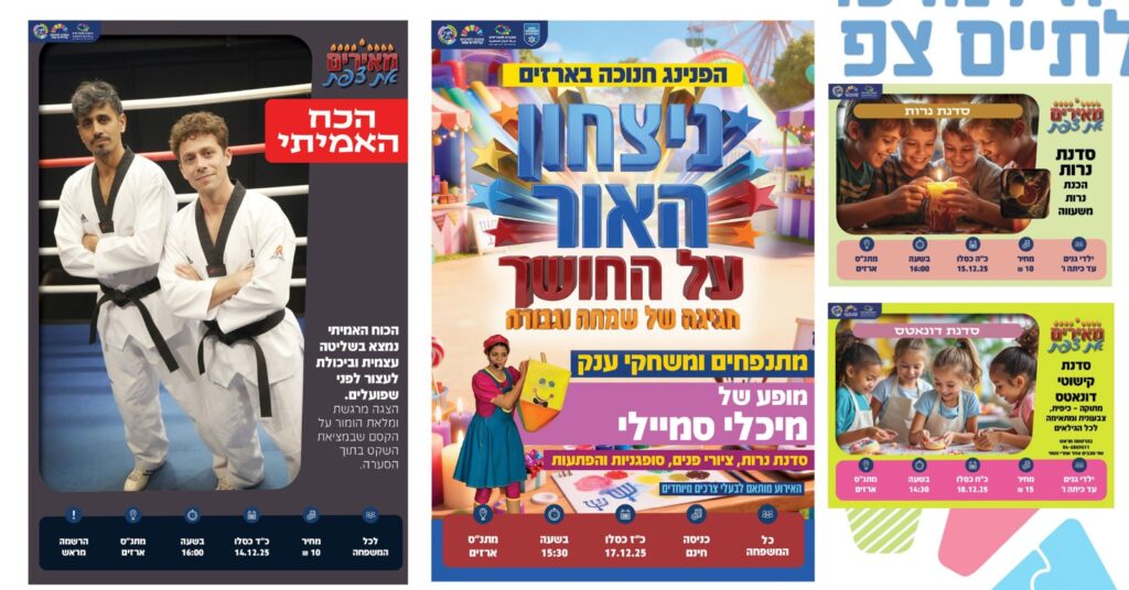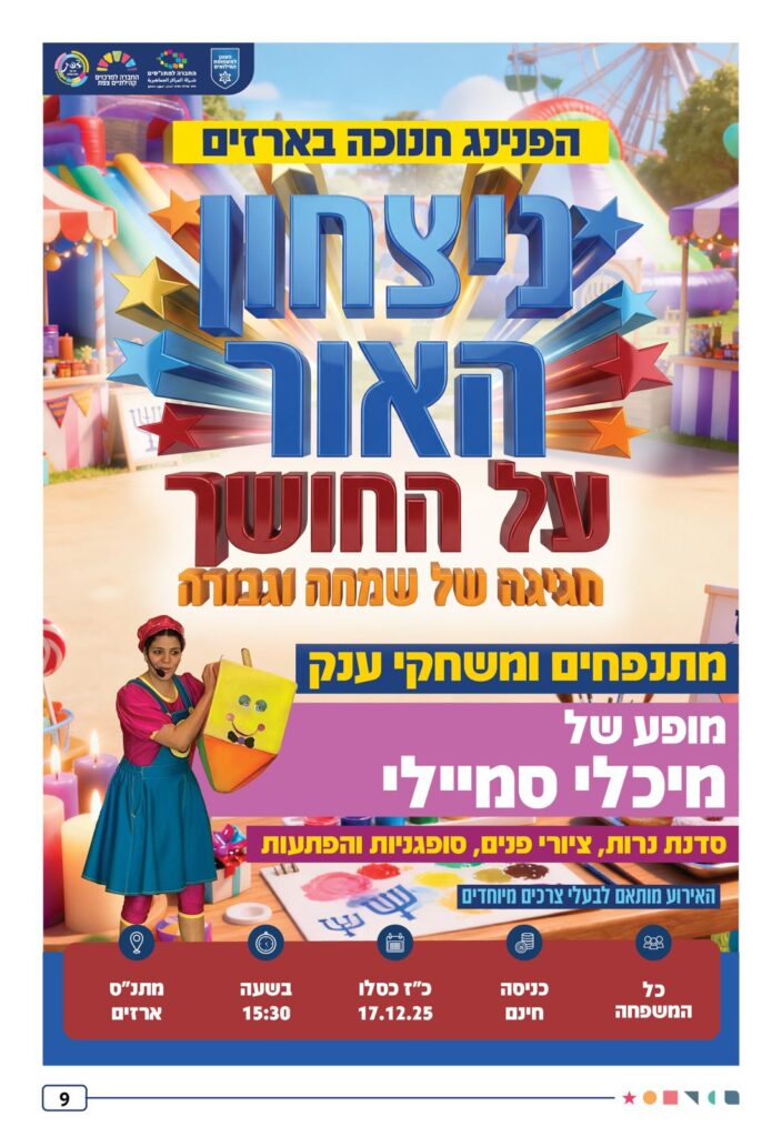 אירוע חנוכה ענקי עם מופע של מיכלי סמיילי, מתנפחים, הפתעות ופעילות חגיגית.